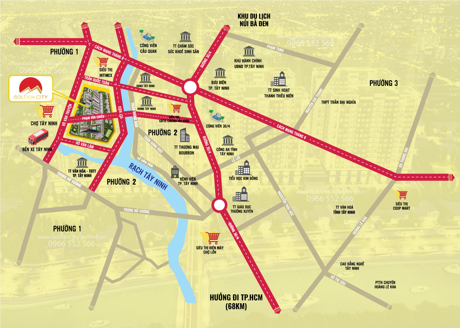Vị trí dự án Golden City Tây Ninh Sở hữu tầm nhìn 3600 trực diện KDL Núi Bà Đen, TP. Tây Ninh và rạch Tây Ninh (một nhánh sông của Vàm Cỏ Đông), với thế tựa sơn hướng thủy thu hút tài lộc. Golden City là tâm điểm vàng hội tụ các yếu tố an cư tốt nhất như kiến trúc hiện đại, không gian thoáng đãng, giao thông thuận tiện, dễ dàng kết nối đến các tiện ích công cộng như chợ Tây Ninh, UBND Tỉnh, Trường học, siêu thị, bệnh viện, công viên 30/4…