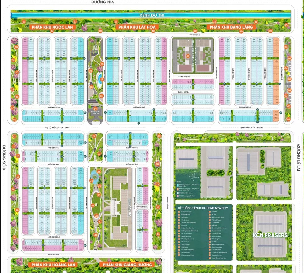 K Home New City được quy hoạch bài bản với 5 phân khu độc đáo mỗi phần khu mang đặc trưng riêng theo từng loại cây đặt theo từng phân khu, mang đến không gian sống xanh hài hòa và hiện đại theo tiêu chuẩn Singapore. Các phân khu gồm Bằng Lăng, Lát Hoa, Ngọc Lan, Hoàng Lan, và Giáng Hương, mỗi khu vực được thiết kế với không gian xanh trải đều, tạo nên môi trường sống bền vững.